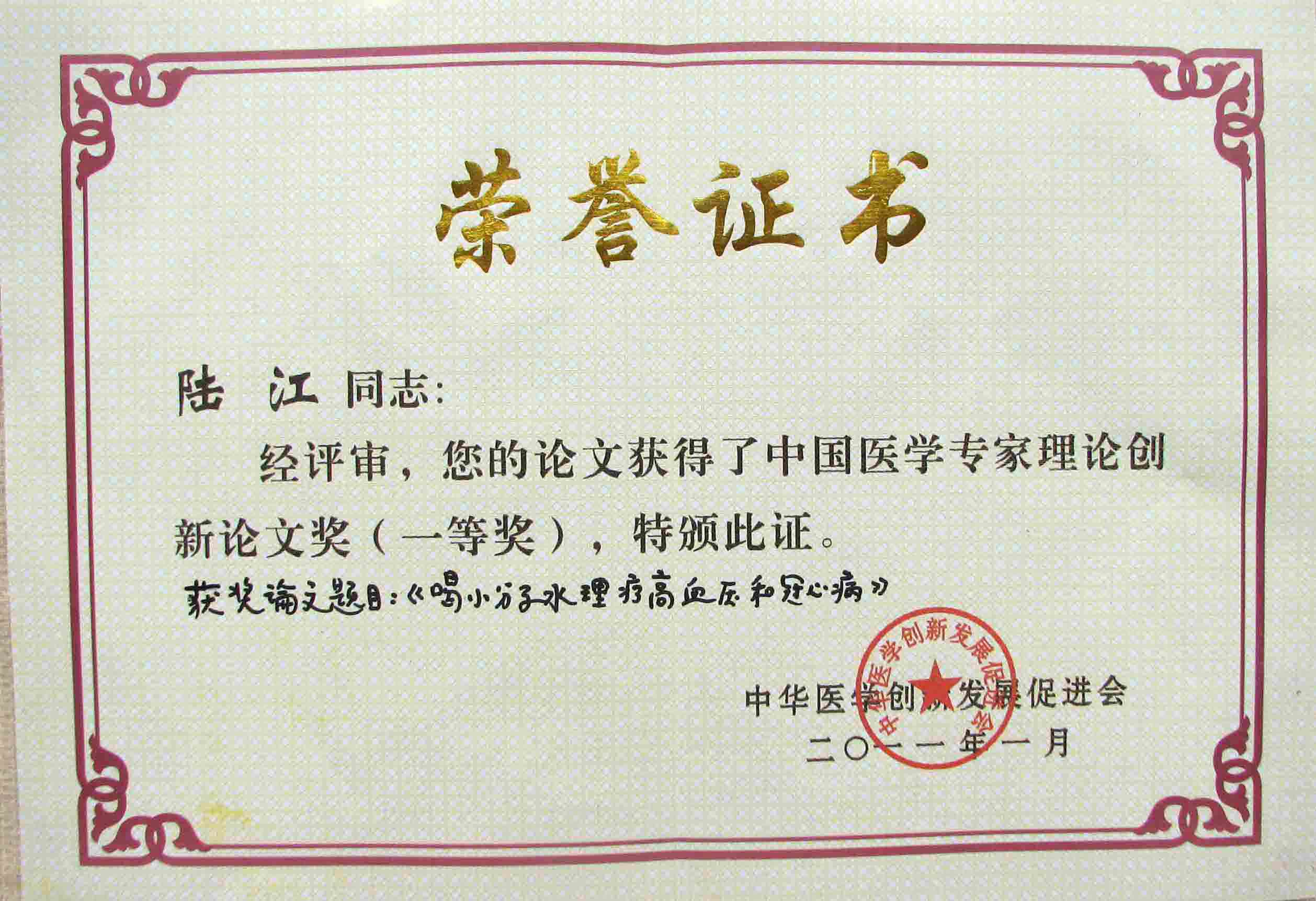 《飲用小分子水治療高血脂》獲優(yōu)秀論文獎(jiǎng)
