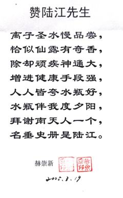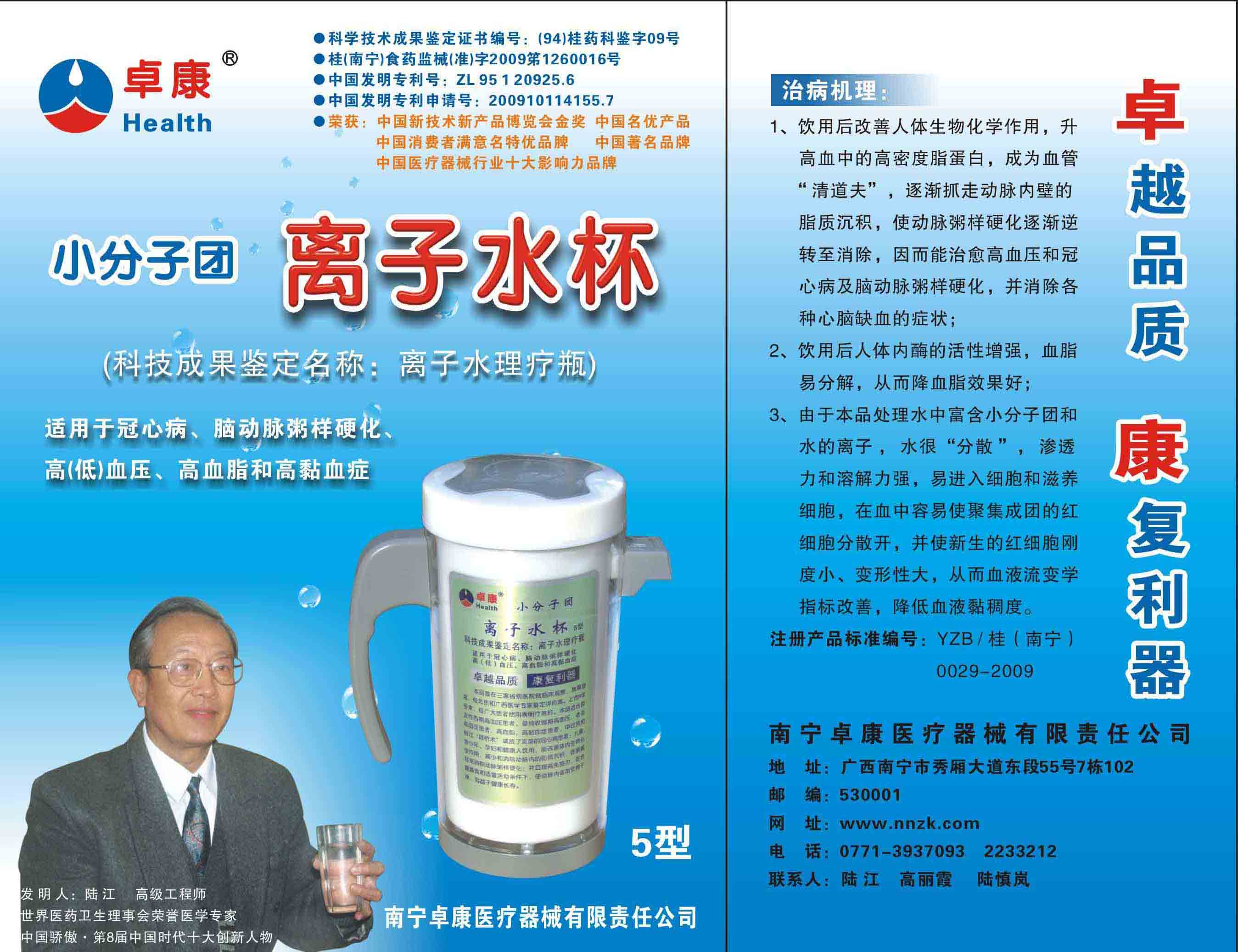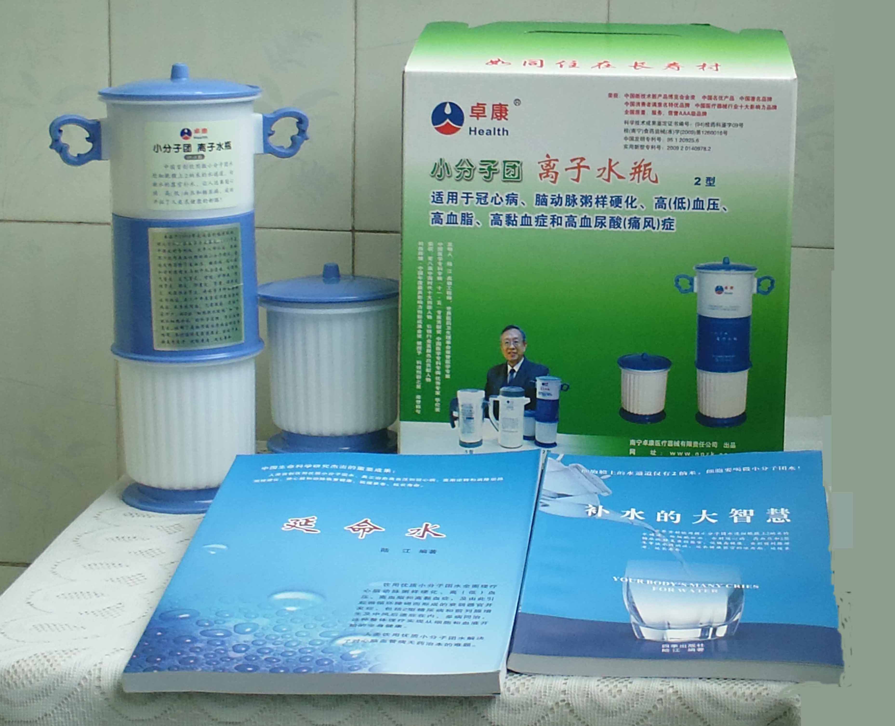 -----我是從事建筑的高工,本來沒有資格去攻克醫(yī)學(xué)難題,卻為了自身健康才扣響醫(yī)學(xué)的大門。由于我1990年患高血壓,因怕中風(fēng)才研究發(fā)明了離子水瓶,我把水處理成微小分子團(tuán)水,飲用后治愈了高血壓。便于1993年底送到三家省級(jí)醫(yī)院做臨床試用4個(gè)月。經(jīng)北京和廣西醫(yī)學(xué)專家鑒定:"降脂降壓效果好"," 能擴(kuò)大心腦動(dòng)脈流量,改善心腦電圖以及微循環(huán)","對(duì)治療心腦動(dòng)脈粥樣硬化、高血壓、高血脂有良好的醫(yī)療保健作用。""產(chǎn)品的技術(shù)性能和療效達(dá)到了同類產(chǎn)品的國內(nèi)領(lǐng)先水平,經(jīng)廣西醫(yī)學(xué)科學(xué)情報(bào)研究所檢索,未見國外有類似報(bào)道。"中國醫(yī)學(xué)科學(xué)院張正國教授從美國國立醫(yī)學(xué)圖書館數(shù)據(jù)庫存Medline檢索英俄文資料,均未見類似報(bào)告。2000年上市后,我為了對(duì)消費(fèi)者負(fù)責(zé)而繼續(xù)觀察研究,一直通過《信譽(yù)卡》和《質(zhì)量跟蹤調(diào)查書》向患者承諾療效,請(qǐng)用戶使用6個(gè)月后反饋效果。和脂壓患者飲用2至5個(gè)月內(nèi),消除癥狀,停服藥物,血壓正常;冠心病患者飲用3~5個(gè)月逐漸減輕至消除心絞痛、房顫等癥狀,不再服藥,飲用1年左右心電圖正常,經(jīng)冠脈造影掃描無明顯狹窄,表明冠心病痊愈。大量患者還反映許多衰弱器官被修復(fù),讓前列腺增生、慢性咽喉炎、慢性氣管炎、支氣管炎、慢性胃炎、腸炎和膽囊炎等不藥而愈;2型糖尿病患者是因?yàn)橐葝u衰弱致病,飲用該水半年至一年,逐漸減藥至停藥,血糖尿糖正常,真正治愈2型糖尿病。中風(fēng)后遺癥患者飲用六七個(gè)月,可逐漸減輕至消除肢體和語言障礙,表明飲用該水能讓壽命很長的神經(jīng)元細(xì)胞逐漸修復(fù),奇跡般地恢復(fù)肢體和語言功能。飲用后還使胸腺和脾臟兩個(gè)重要的免疫器官被修復(fù)和增強(qiáng),產(chǎn)生免疫細(xì)胞多,提高了免疫力,使人不生病或少生病。自此, 飲用微小分子團(tuán)水創(chuàng)造了攻克冠心病、高(低)血壓和糖尿病三大醫(yī)學(xué)難題的奇跡。人們對(duì)此感到不可思議,但實(shí)踐是檢驗(yàn)真理的唯一標(biāo)準(zhǔn)。