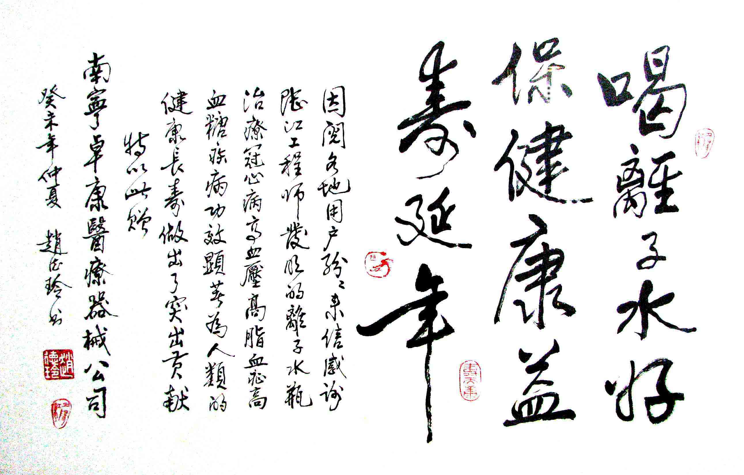 - -- 幾千年來,人類靠醫(yī)藥不能根治冠心病、高血壓和糖尿病,如想根治,那是夢想。可是,我從中國基礎(chǔ)醫(yī)學(xué)研究成果受到啟發(fā),研發(fā)了一種發(fā)明產(chǎn)品,處理出微小分子團(tuán)水讓人飲用,實(shí)現(xiàn)了人類這一夢想!患者飲用后遠(yuǎn)離了冠心病、高血壓和2型糖尿病。這一成果曾經(jīng)過臨床試用和專家鑒定,作為準(zhǔn)字號(hào)醫(yī)療器械讓廣大患者飲用,療效進(jìn)行跟蹤調(diào)查。很多患者的反饋情況令人感動(dòng),我放在公司網(wǎng)站上(nnzk.com),震撼了醫(yī)學(xué)專家,也使廣大同胞受到啟發(fā)。人們盼望飲用它給細(xì)胞補(bǔ)水,治愈多種病癥,既省錢,又安全,而且延長壽命。