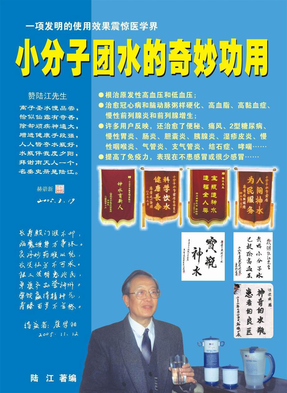 人類幾千年來患以上病癥需終生服藥,幾十年也不能治愈。可是我國南寧的高級(jí)工程師陸 江,于1990年想根治高血壓,研究發(fā)明了離子水瓶,處理出微小分子團(tuán)水供飲用,經(jīng)過醫(yī)院臨床試用和專家鑒定,1999年獲中國發(fā)明專利權(quán),產(chǎn)品于2000年投放市場后一直跟蹤調(diào)查,據(jù)全國各地用戶反饋:祛除了高低血壓、糖尿病和冠心病,并使前列腺增生、咽喉炎、鼻竇炎、慢性氣管炎、支氣管炎、矽肺病、哮喘、慢性胃炎、腸炎、慢性膽囊炎、慢性腎炎、腎衰、膀胱炎、便秘、痔瘡、風(fēng)濕性關(guān)節(jié)炎和濕疹皮炎及中風(fēng)后遺癥等病癥不藥而愈。為什么喝微小水能治20多種病?陸 江從1991年德國科學(xué)家發(fā)現(xiàn)細(xì)胞膜水通道僅為2納米獲得啟發(fā),認(rèn)為多種器官患病是因細(xì)胞脫水,不能正常代謝和分裂增殖,才使器官細(xì)胞減少致衰弱萎縮而形成細(xì)胞缺水性病癥。22年來的實(shí)踐有力地支持了“細(xì)胞脫水致病”這一重要論點(diǎn),表明喝微小水可滿足細(xì)胞的生理需求,補(bǔ)水就能祛病,是生命科學(xué)新亮點(diǎn)。