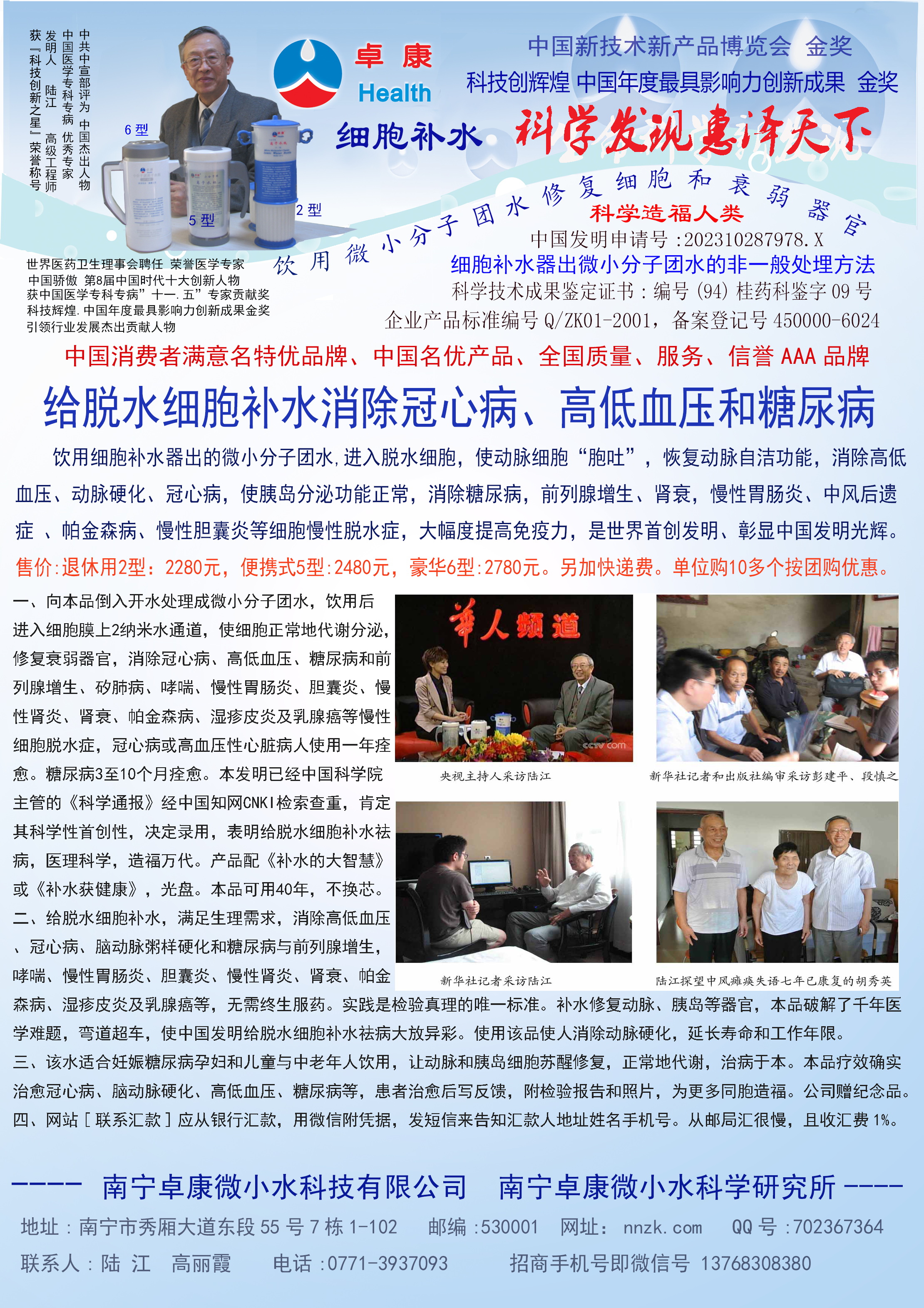 - -----南寧卓康微小水科技有限公司原為南寧卓康醫(yī)療器械有限責(zé)任公司 ,用戶普遍反饋高血壓患者飲用2—5個(gè)月,癥狀消除,不再服藥,治愈了高血壓; 冠心病患者,包括已做和未做支架或搭撟手術(shù)者,經(jīng)3—5個(gè)月飲用,消除心痛、胸悶、早搏、房顫和心絞痛等癥狀,逆轉(zhuǎn)至消除動(dòng)脈粥樣硬化和斑塊,一年左右治愈冠心病,心腦電圖正常,經(jīng)冠脈造影掃描無明顯狹窄,表明冠心病痊愈;糖尿病人飲用3-10個(gè)月,血糖尿糖正常,治愈2型糖尿病; 并且使前列腺增生、低血壓、腦萎慢性咽喉炎、慢性氣管炎、支氣管炎、哮喘、矽肺病、甲亢、慢性胃腸炎、膽囊炎、慢性腎炎、腎衰、風(fēng)濕性關(guān)節(jié)炎、痔瘡和濕疹皮炎及中風(fēng)癱瘓或偏癱失語后遺癥等不藥而愈,且多病同治,無需終生服藥,彌補(bǔ)了幾千年來藥物的欠缺,使“微小水”成為人類消除高血壓、冠心病和糖尿病的寶貴資源。腦動(dòng)脈粥樣硬化、低血壓和前列腺增生患者,一般飲用四個(gè)月痊愈;中風(fēng)后遺癥患者,一般飲用8個(gè)月痊愈。請(qǐng)?jiān)旈啞队脩舴答仭窓谀恐写罅炕颊叩姆答佇拧z測報(bào)告,有的還附照片。產(chǎn)品屢獲大獎(jiǎng),論文也屢獲一等獎(jiǎng)。廣大用戶好評(píng)不斷,有口皆碑。